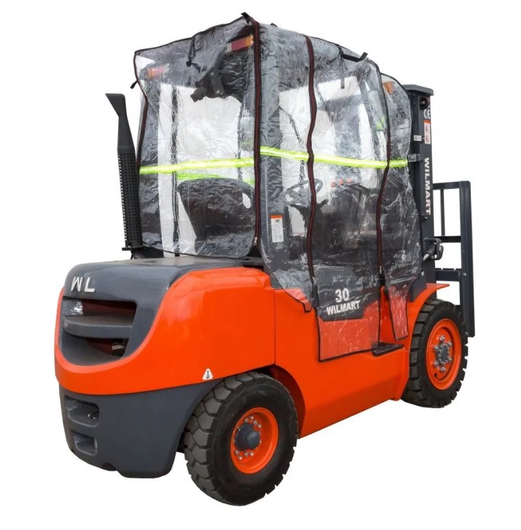 Мягкая кабина предназначена для защиты оператора погрузчика от воздействия внешней окружающей среды, от ветра, осадков и насекомых. Благодаря своей высокой плотности она максимально устойчива к разрывам и разнообразному механическому воздействию. Помимо этого данный материал не теряет параметров при перепаде температуры, не разрушается под воздействием ультрафиолетовых излучений, не пропускает воду, что особенно важно в процессе использования под открытым небом. Поддерживать в чистоте подобный материал также весьма просто, делать это возможно бытовыми средствами.