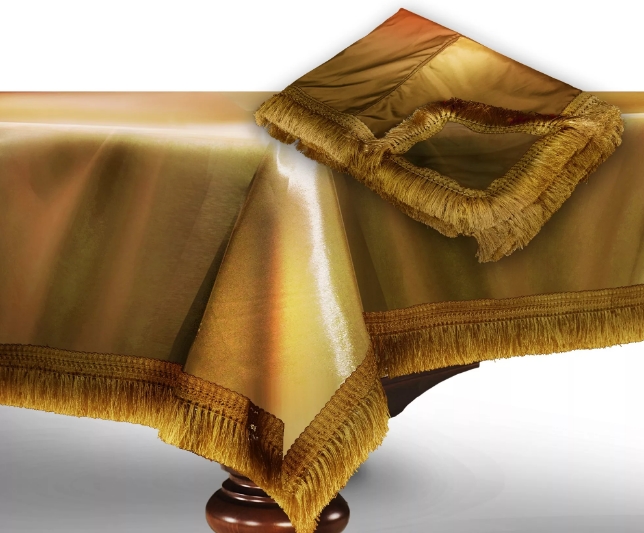 У нас вы можете приобрести специальное покрывало на бильярдный стол размером в 9 футов. Данный вариант без резинки, однако, покрывало прекрасно держится на бильярдном столе. Изготовлено оно из такого материала, как синтетика, это очень мягкий и приятный на ощупь материал, который смотрится дорого и эстетично. По краям покрывало украшено кисточками, которые делают его ещё интереснее. Это покрывало премиум класса, естественно, есть варианты попроще. У покрывала золотой цвет, этот цвет прекрасно подойдет к бильярдной комнате с практически любым интерьером.