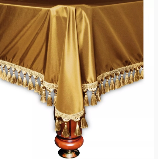 Сделано данное покрывало из шелкового материала. Такой материал не портится со временем, он очень износостойкий и прочный на разрыв. Это не влагостойкое покрытие, которое, однако, не пропустит через себя влагу и надежно защитит стол. У покрывала золотой цвет, если данный цвет не подходит к вашей бильярдной комнате, в нашем каталоге вы можете выбрать другой вариант. Покрывало отлично держится на бильярдном столе и совершенно не сползает с него.