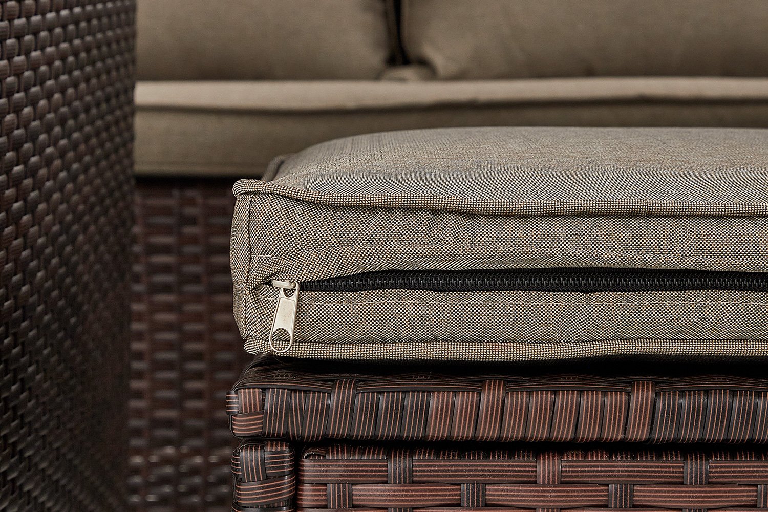 Набор садовой мебели представляет собой диван, двое кресел, два пуфа и обеденный стол. Такая комплектация сможет вместить в себя до 7 взрослых человек, что похоже на большую семью или группу друзей.