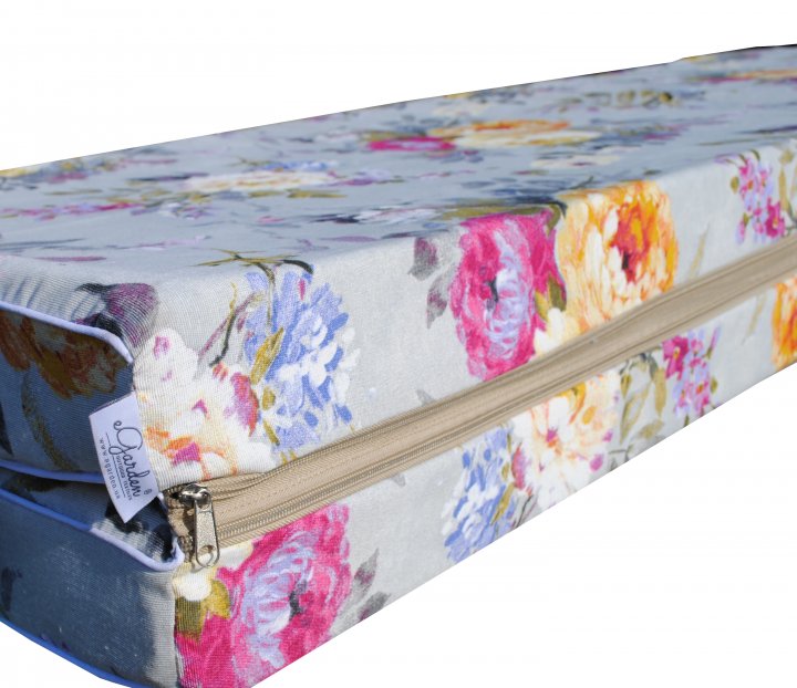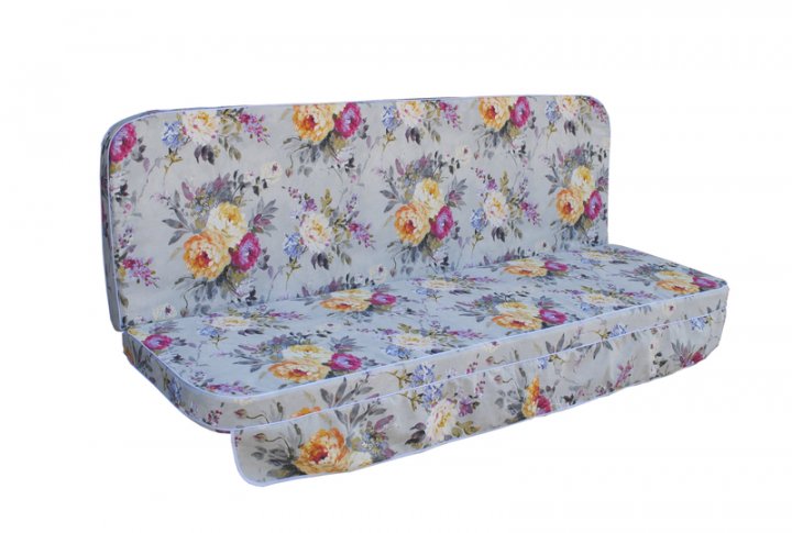 Данный матрас предназначен для садовой качели. Такие матрасы изготавливаются из универсальных тканей, изготовленных в Испании. Благодаря тому, что в такой ткани огромный процент натуральных волокон, она замечательно пропускает воздух, а также является максимально приятной на ощупь. Эта ткань устойчива к появлению пятен, она с лёгкостью разглаживается. Наполнитель изготовлен из пенополиуретана вторичного вспенивания. Спинка, а также сиденье матраса выполнены на молнии, поэтому наполнитель с лёгкостью можно вынуть, а чехол легко можно постирать. Для того, чтобы матрас надёжно держался на качели, на нём есть специальные завязки по бокам.